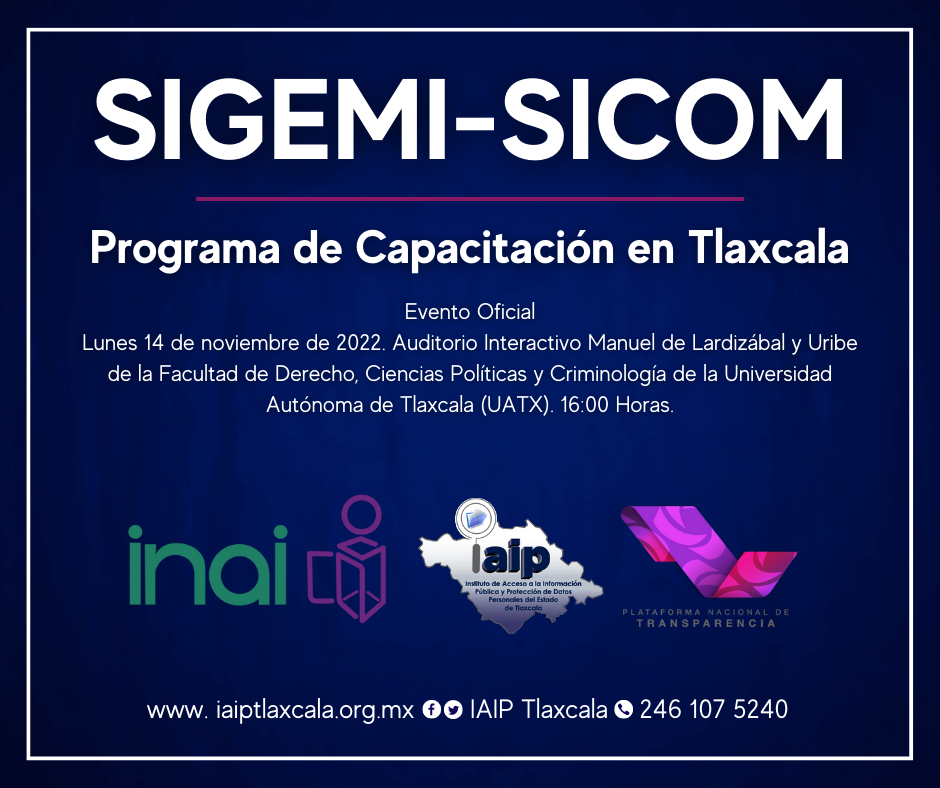 El Instituto de Acceso a la Información Pública y Protección de Datos Personales del Estado de Tlaxcala (IAIP) implementará a partir de este miércoles, el Sistema de Comunicación entre Organismos Garantes y Sujetos Obligados (SICOM) y el Sistema de Gestión de Medios de Impugnación (SIGEMI), ambos de la Plataforma Nacional de Transparencia.