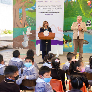 La gobernadora Lorena Cuéllar Cisneros entregó la rehabilitación de los edificios A, B y C, además de obra exterior en el preescolar “Leonarda Gómez Blanco”, ubicada en el municipio de Chiautempan, en los que destinó una inversión de 494 mil 871 pesos en beneficio de casi 100 niñas y niños.