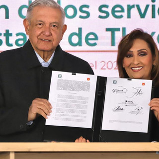 El presidente de México, Andrés Manuel López Obrador; la gobernadora Lorena Cuéllar Cisneros; el secretario de Salud, Jorge Alcocer y el director general del Instituto Mexicano del Seguro Social (IMSS), Zoé Robledo Aburto, firmaron el Convenio Marco para la Transformación de los Servicios de Salud del Estado de Tlaxcala.