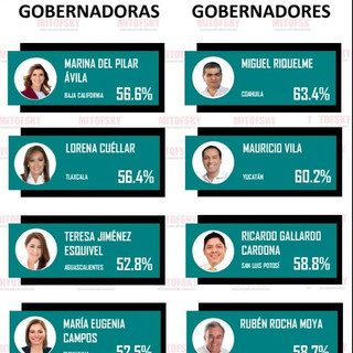 La casa encuestadora refiere que de las mandatarias del país, ocupa el primer escaño la gobernadora de Baja California, Marina del Pilar Ávila, con el 56.6 por ciento; segundo lugar, la gobernadora, Lorena Cuéllar Cisneros, con 56.4 por ciento; tercer lugar, Aguascalientes, Teresa Jiménez Esquivel, con 52.8 por ciento; en cuarto sitio, Chihuahua, María Eugenia Campos, con 52.5 y, en quinto lugar, Quintana Roo, Mara Lezama, con 51.8 por ciento.En tanto, en el grupo de los 17 mejor evaluados a nivel nacional, la mandataria tlaxcalteca está ubicada dentro de los 10 primeros lugares, es decir, Cuéllar Cisneros ocupa el sitio siete, con 56.4 por ciento de aprobación; en dicho apartado es el gobernador de Coahuila, Miguel Riquelme, quien se coloca en el primer lugar con 63.4 por ciento.Además, los mejores evaluados, afines al Movimiento de Regeneración Nacional (Morena), la mandataria local, se ubica en la cuarta posición con 56.4 por ciento. Mientras que el gobernador de San Luis Potosí, Ricardo Gallardo Cardona ocupa el primer lugar con 58.8 por ciento y le sigue en segundo lugar, de Sinaloa, Rubén Rocha Maya con 58.7.