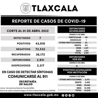#AIGCcTlx | REGISTRA SESA 7 CASOS POSITIVOS Y CERO DEFUNCIONES DE COVID-19 EN TLAXCALA