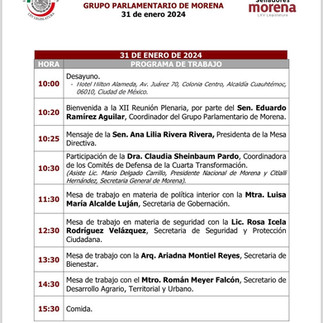 Aproximadamente a las 13:30 horas, detalla el programa, las y los integrantes del Grupo Parlamentario de Morena sostendrán un encuentro con Ariadna Montiel Reyes, quien encabeza la Secretaría de Bienestar.