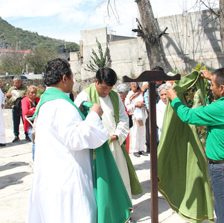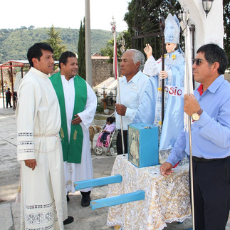 Posteriormente minutos antes del mediodía, se encamino a la iglesia del lugar, quien fue acompañado por familiares, amigos y vecinos de la localidad, llegando al templo, fue recibido por el Santo Patrono San Ambrosio, así como el cuadro de la iglesia y fiscales, a quienes agradeció el gesto, en compañía del párroco de San Mateo Huexoyucan, Carlos Gutiérrez, también estuvo presente el padre Sergio George, como un gesto de algarabía, los vecinos decoraron con banderas blancas, el camino por donde camino el contingente.