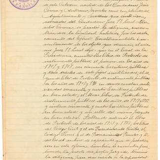 Al reverso de la hoja marcada con el número 4 se aprecia un sello con la leyenda Ayuntamiento Constitucional del Municipio de Panotla, Estado L. y S de Tlaxcala, en el texto a la letra dice:En la municipalidad de Panotla a las diez de la mañana del día dos del mes de diciembre, del año de mil novecientos catorce, constituido el ciudadano presidente municipal provisional en la localidad del juzgado 1° local de esta cabecera asistido de los ciudadanos Jesús Corona y Antonino Morales, como empleados del ayuntamiento y secretario que autoriza, asociados del ciudadano juez 1° local Aurelio Corona, se practicó la diligencia encontrándose la localidad habitada por los destacamentos del Ejército Constitucionalista e inventariando los objetos que denuncia el mismo juez 1° local dijo: que en el local de la presidencia encontró tres libros de protocolo de instrumentos públicos el primero de los años de 1907 y 1908 con cincuenta escritura públicas y tiene señales de siete fojas inutilizadas, en el segundo libro de protocolo de instrumentos públicos de los años de 1909 y 1910 en donde constan autorizadas cincuenta y cuatro escrituras públicas en buen estado; el tercer libro de protocolo de instrumentos de públicos de los años de 1911 y 1912 y contiene cincuenta y cuatro escrituras públicas en buen estado y un sello del mismo juzgado en buen estado. Faltando además el libro del Código Civil y el de procedimientos civiles, el código penal y el de procedimientos penales y todos los archivos de expedientes que se practicaron en esta oficina, también se encuentra fracturada la puerta del mismo juzgado, termina la diligencia para dar cuenta a la superioridad como esta mandatado con el oficio número 7 de fecha 28 del mes próximo pasado, doy fe.Firmando el presidente provisional Antonino Morales, Antonio E Meneses, Aurelio Corona, Jesús Corona