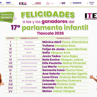 El Instituto Tlaxcalteca de Elecciones (ITE) entregó este miércoles las constancias que acreditan a las y los 15 niños y niñas que integrarán el Parlamento Infantil 2026 por la vía de mayoría relativa.