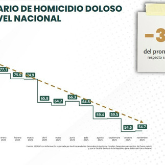 De acuerdo con el reporte del SESNSP, en los últimos 14 meses, se ha mantenido una tendencia a la baja en el homicidio doloso, pues el promedio diario por año disminuyó en 35 por ciento respecto al 2018, pasando de 100.5 a 65.1, lo que indica que 2025 es el año con menos homicidios.