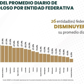 En el caso de Tlaxcala, la reducción es de 15.3%, con base en la estadística del mes de noviembre presentada por la funcionaria federal este día durante la conferencia matutina “Las mañaneras del pueblo” encabezada por la presidenta de México, Claudia Sheinbaum Pardo, quien resaltó que, gracias a la implementación de la Estrategia Nacional de Seguridad, se logró una reducción del 37 por ciento en el promedio diario de homicidios dolosos, de septiembre de 2024 a noviembre de 2025.