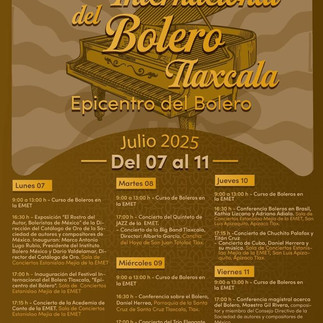 La Secretaría de Cultura (SC) anunció el Primer Festival Internacional del Bolero, que se llevará a cabo, del 7 al 11 de julio, en Tlaxcala bajo el lema “Epicentro del Bolero”, con el objetivo de honrar, preservar y proyectar uno de los géneros musicales más emblemáticos de América Latina.