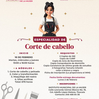 El curso con Especialidad en Corte de Cabello, dará inicio el próximo 18 de febrero, y se impartirá en coordinación con el ICATLAX mediante una cuota de 350 pesos, los días martes, miércoles y jueves, de 13:00 a 16:00 horas, con una duración total de 670 horas distribuidas en cuatro módulos: corte de cabello y peinado, color y transformación, maquillaje del rostro y uñas acrílicas.
