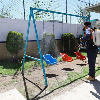 Las actividades comenzaron en el Jardín de Niños “Antonino González Abascal”, de la primera sección, donde el personal de Protección Civil realizó la sanitización de salones, patios, baños, oficinas y áreas de juegos, así como puertas, ventanas y barandales.