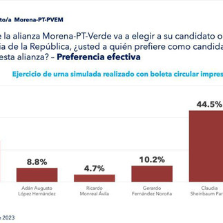 Lo anterior, como parte de un ejercicio de urna simulada con boleta circular impresa con fotos y nombres, llega hasta el 44.5% en términos de preferencia efectiva, lo que le representaría a Sheinbaum una ventaja de +18.8% sobre Marcelo Ebrard, quien se ubica en el segundo puesto.