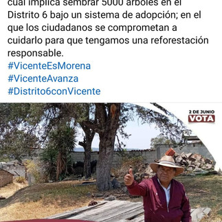 Con una campaña de acciones responsables y congruentes, Vicente Morales conquista el distrito 6, realizando en acto simbólico pero altamente significativo en materia de medio ambiente, pues con su programa "Reto 5 mil" de adopción de árboles se asegura la prosperidad y cuidado de los mismos, ya que han existido campañas de reforestación que terminan en recursos desperdiciados, pues no prospera el crecimiento de los mismos. Por Miguel Angel Garcia Valencia by #AgenciaInformativaGraphosCcTlx